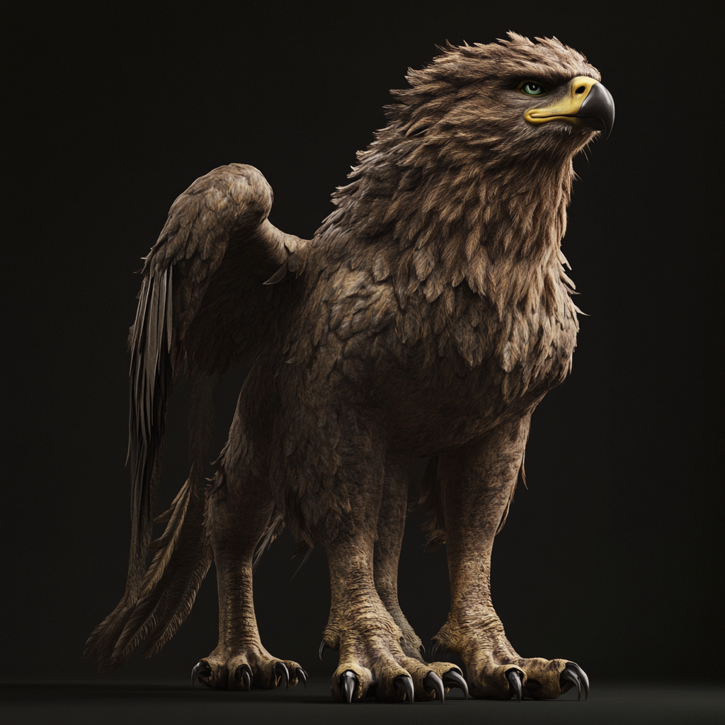 Die Berggreifen, angepasst an das felsige Terrain von Poromiel, besitzen ein robustes, dunkelbraunes bis anthrazitfarbenes Gefieder, das sie vor dem eisigen Wind schützt. Eine dichte Mähne schirmt sie zusätzlich ab, während ihr kräftiger, kurzer Schwanz die Balance auf steilen Felsen unterstützt.