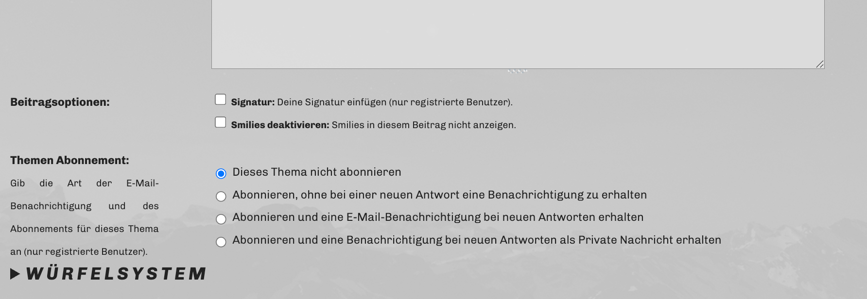 | Um das Würfelsystem zu nutzen, müsst ihr beim Antworten auf eine Szene unten das Würfelsystem ausklappen. Diese Funktion steht in allen Inplay- und im Nebenplaybereichen zur Verfügung.