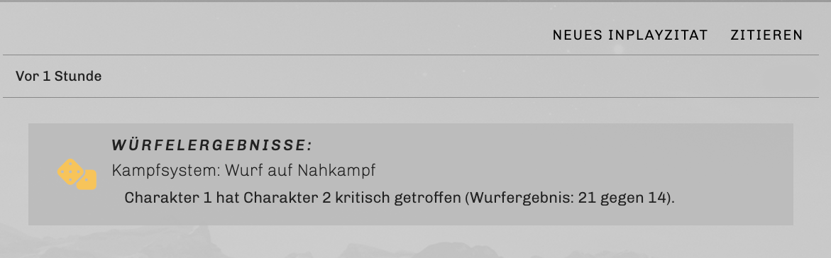 Das Ergebnis eures Wurfs wird euch nach dem Klicken auf den Würfel-Button direkt angezeigt, bleibt auch in der Postvorschau unten an der Stelle des Würfelsystems sichtbar und wird über eurem Post ausgegeben, nachdem er abgeschickt wurde. So können eure Postingpartner:innen sehen, was ihr erwürfelt habt.