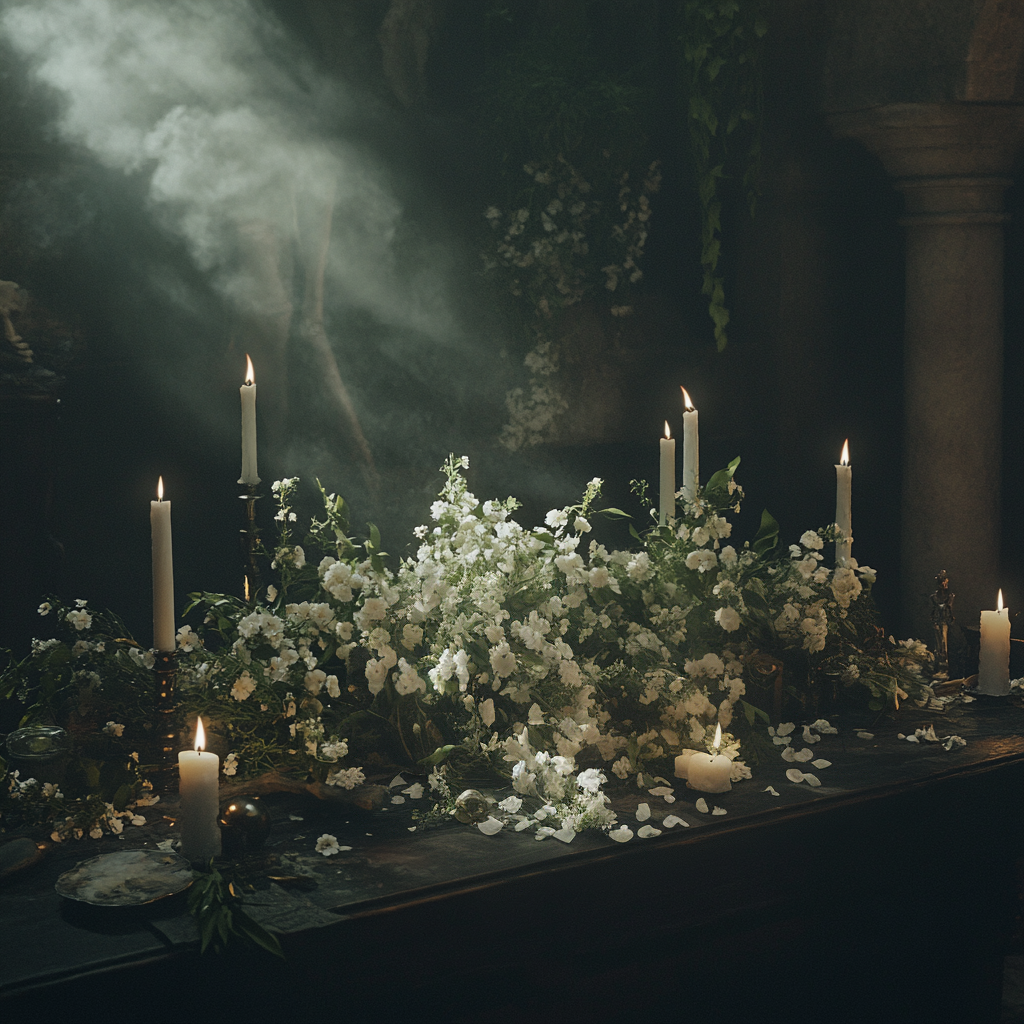 Das Ritual des Übergangs (01.11.) ist ein stiller Gedenktag, der an die erste Seele erinnert, die den Übergang ins Jenseits vollzog. Der Legende nach schuf Malek, der Hüter des Todes, das Reich der Toten, um den Seelen einen Ort des Friedens zu geben. Seine Tränen fielen auf die Erde und brachten weiße Blumen hervor – Symbole der Reinheit und des Abschieds. Der Tag dient nicht nur dem Gedenken an die Verstorbenen, sondern auch der Besinnung auf den natürlichen Kreislauf von Leben und Tod. Es ist eine Zeit, um innezuhalten, loszulassen und die Erinnerung an die Verstorbenen zu bewahren.
