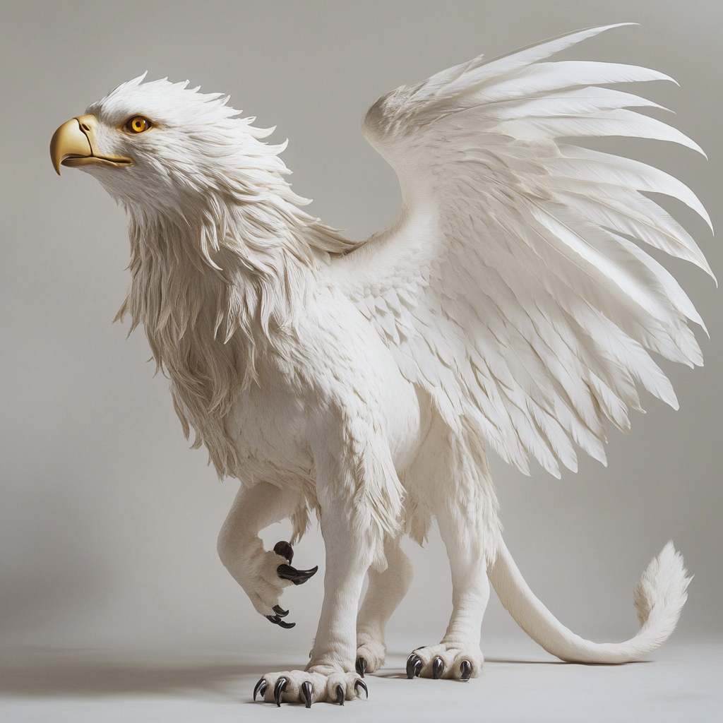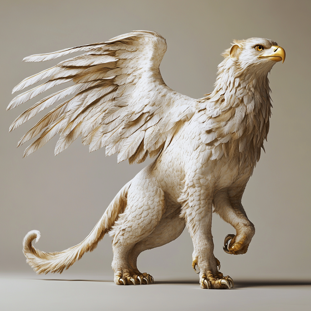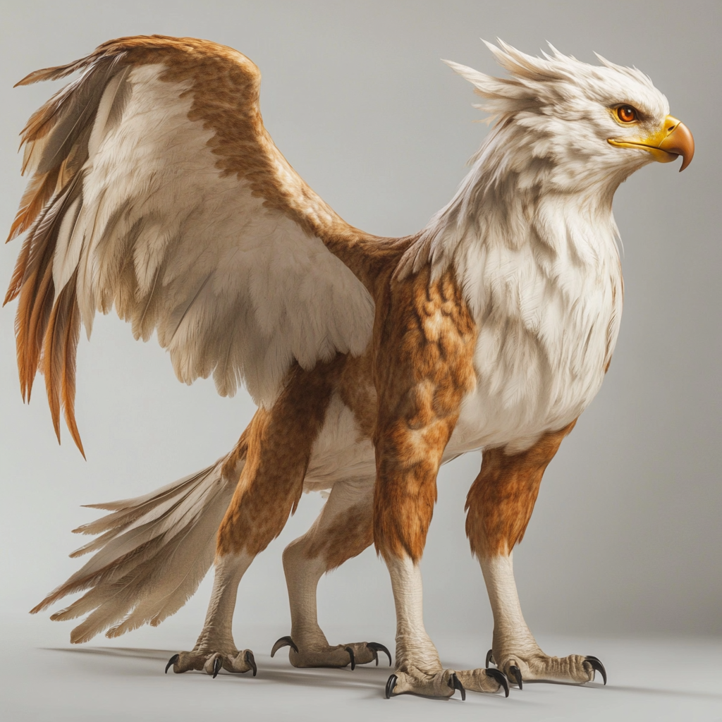 Steppengreifen sind mit golden bis sandfarbenem Gefieder ausgestattet und perfekt für die offenen Ebenen angepasst. Ihr schlanker, muskulöser Körper und die große Flügelspannweite erlauben weite Flüge und schnelle Landbewegungen. Die goldene Mähne und der lange, buschige Schwanz bieten Stabilität und lenken sie bei schnellen Manövern.
