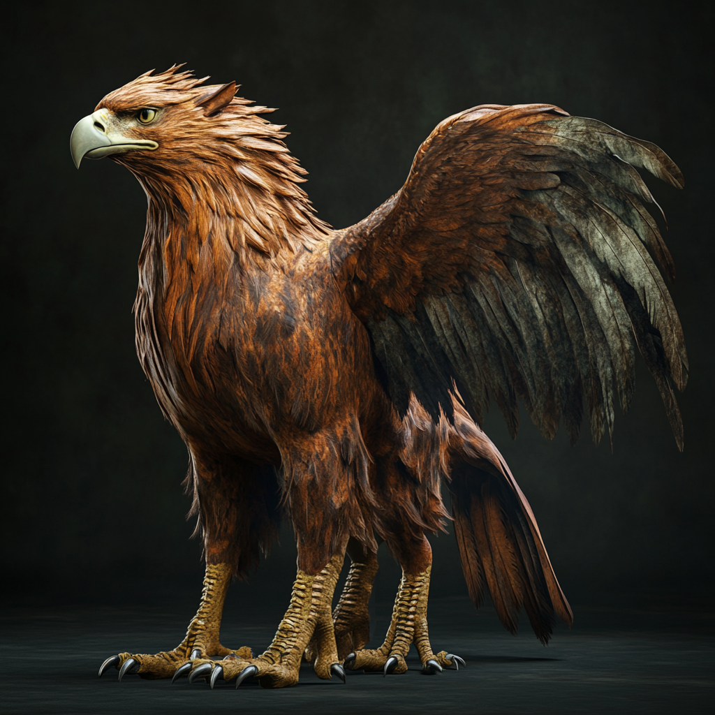 Die Berggreifen, angepasst an das felsige Terrain von Poromiel, besitzen ein robustes, dunkelbraunes bis anthrazitfarbenes Gefieder, das sie vor dem eisigen Wind schützt. Eine dichte Mähne schirmt sie zusätzlich ab, während ihr kräftiger, kurzer Schwanz die Balance auf steilen Felsen unterstützt.