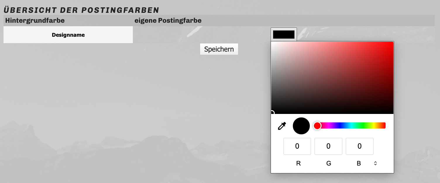 Hierfür müsst ihr einmal neben dem Namen des Designs in der Spalte eigene Postingfarbe auf das Farbfeld klicken. Dort könnt ihr eure designspezifische Farbe entweder über einen RGB-Code eingeben oder über die Palette eine Farbe raussuchen.