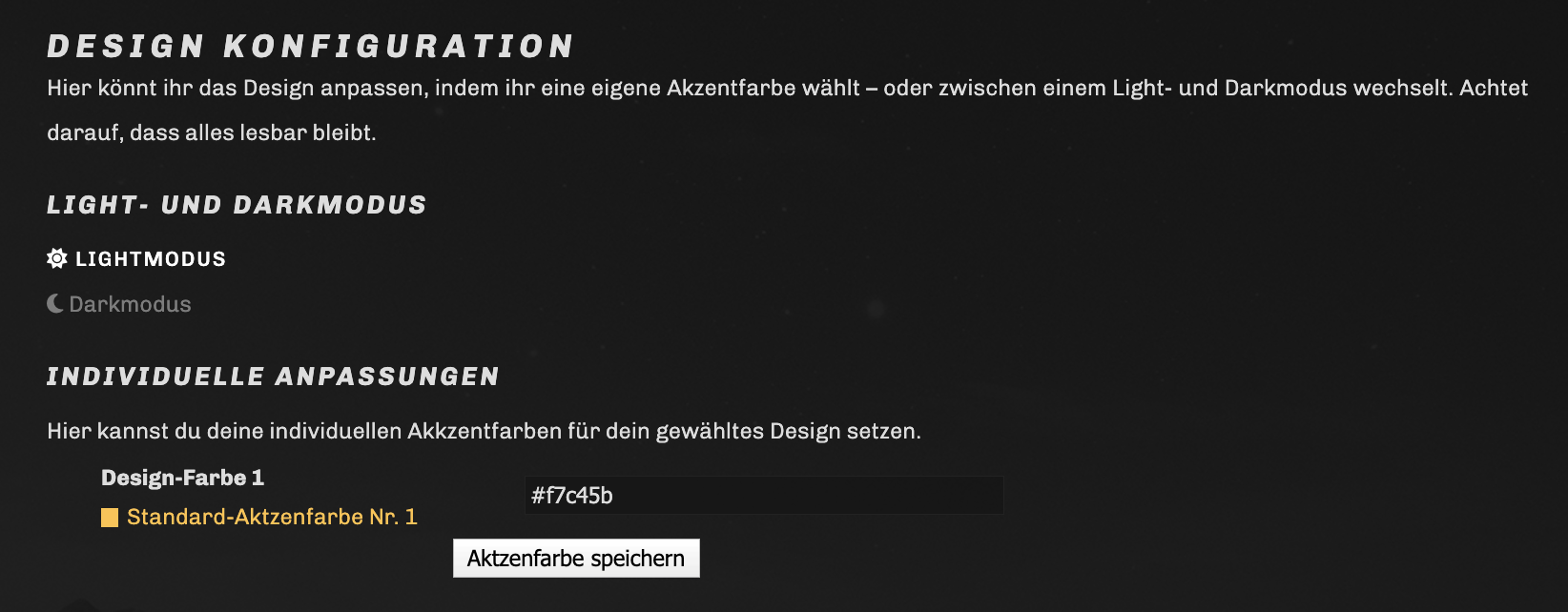 Da unsere Designs eine Akzentfarbe nutzen, könnt ihr diese auch personalisieren. Dies geht über die gleiche Seite im UCP über das Feld Design-Farbe. Um eine neue Farbe einzutragen, braucht ihr deren HEX-Farbcode. Vergesst hier bitte nicht die #, sonst kann die Farbe nicht korrekt umgesetzt werden.