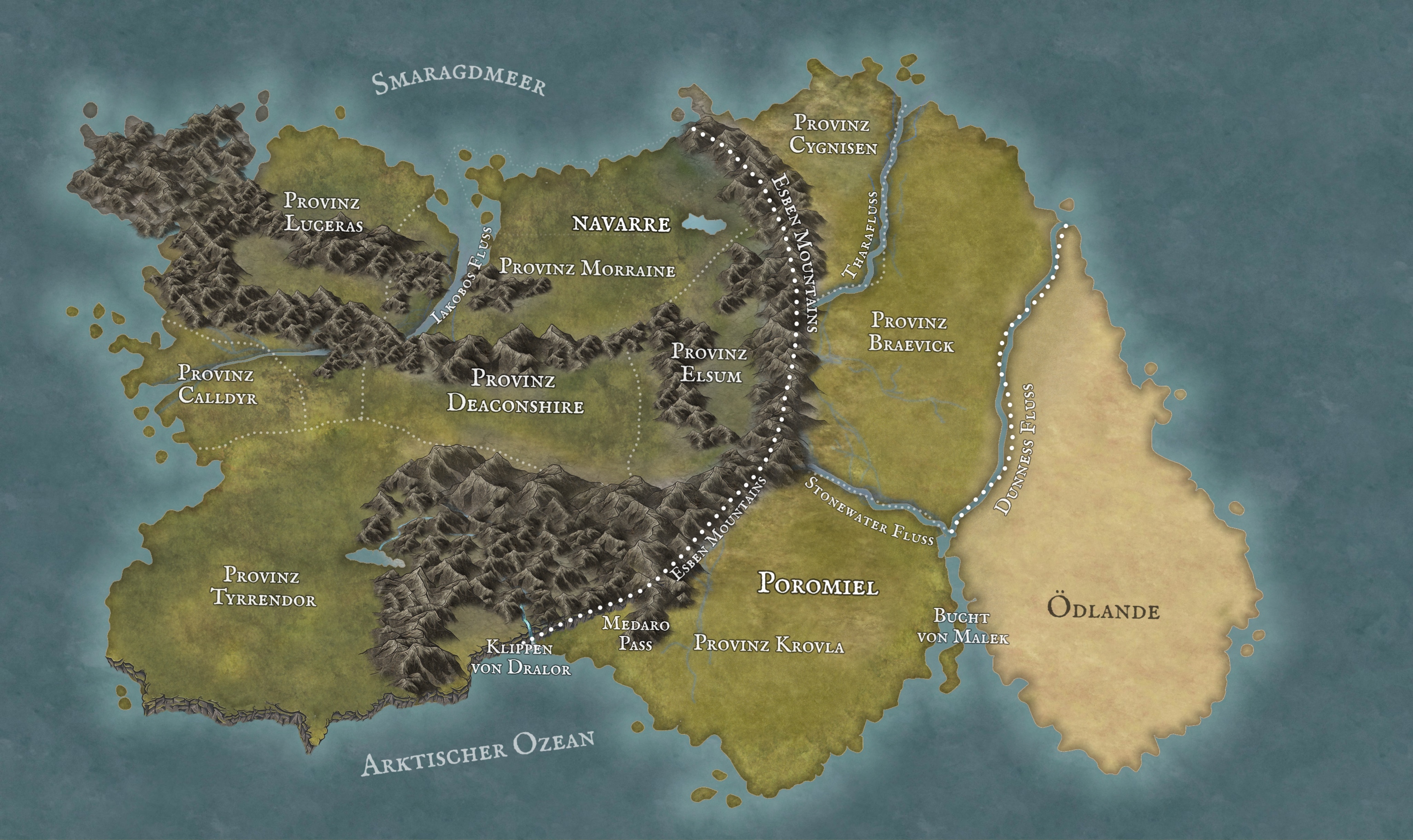Die Bekannte Welt besteht aus einem zusammenhängenden Kontinent, der von den unermesslichen Weiten des Arktischen Ozeans im Süden und des Smaragdmeers im Norden umgeben ist. Der Kontinent ist in zwei Königreiche unterteilt: Navarre und Poromiel. Östlich von Poromiel erstrecken sich die Ödlande, die aufgrund ihrer extremen Bedingungen als unbewohnbar gelten. Die Karte bietet einen umfassenden Überblick über die geopolitischen Grenzen, die natürlichen Gegebenheiten und die kulturellen Zentren dieser Welt.